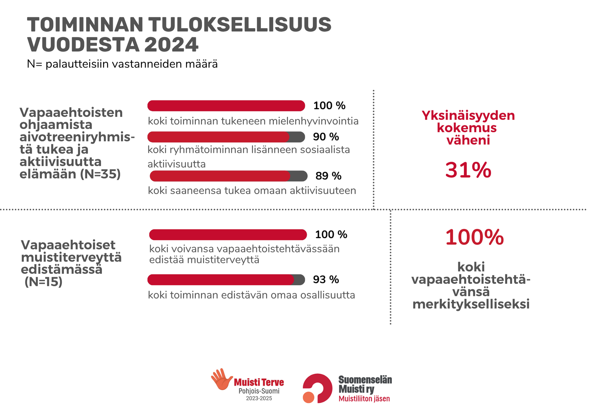 Tuloksien perusteella 98 prosenttia olivat tyytyväisiä FINGER-ryhmätoimintaan. NPS luku oli 95 (0–100 asteikolla) eli ryhmätoimintaan osallistuneista ja palautteisiin vastanneista todennäköisesti tai erittäin todennäköisesti suosittelevat toimintaa muille.